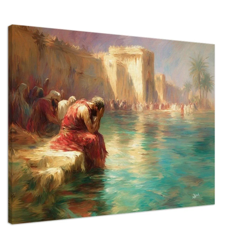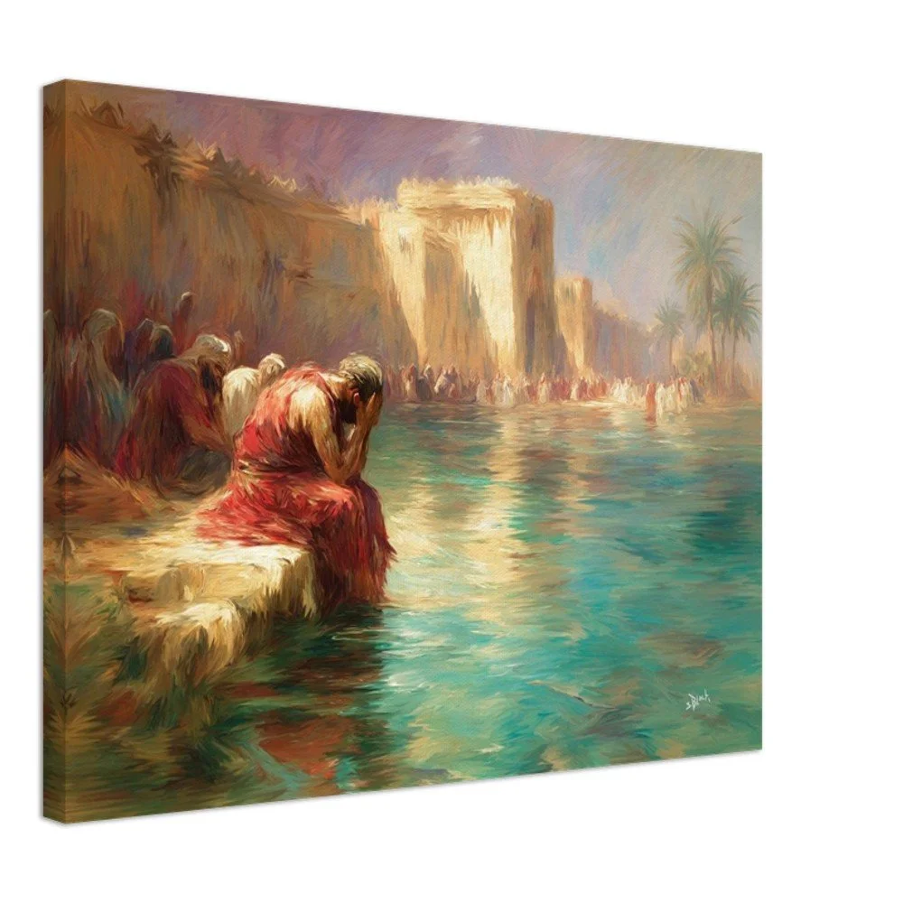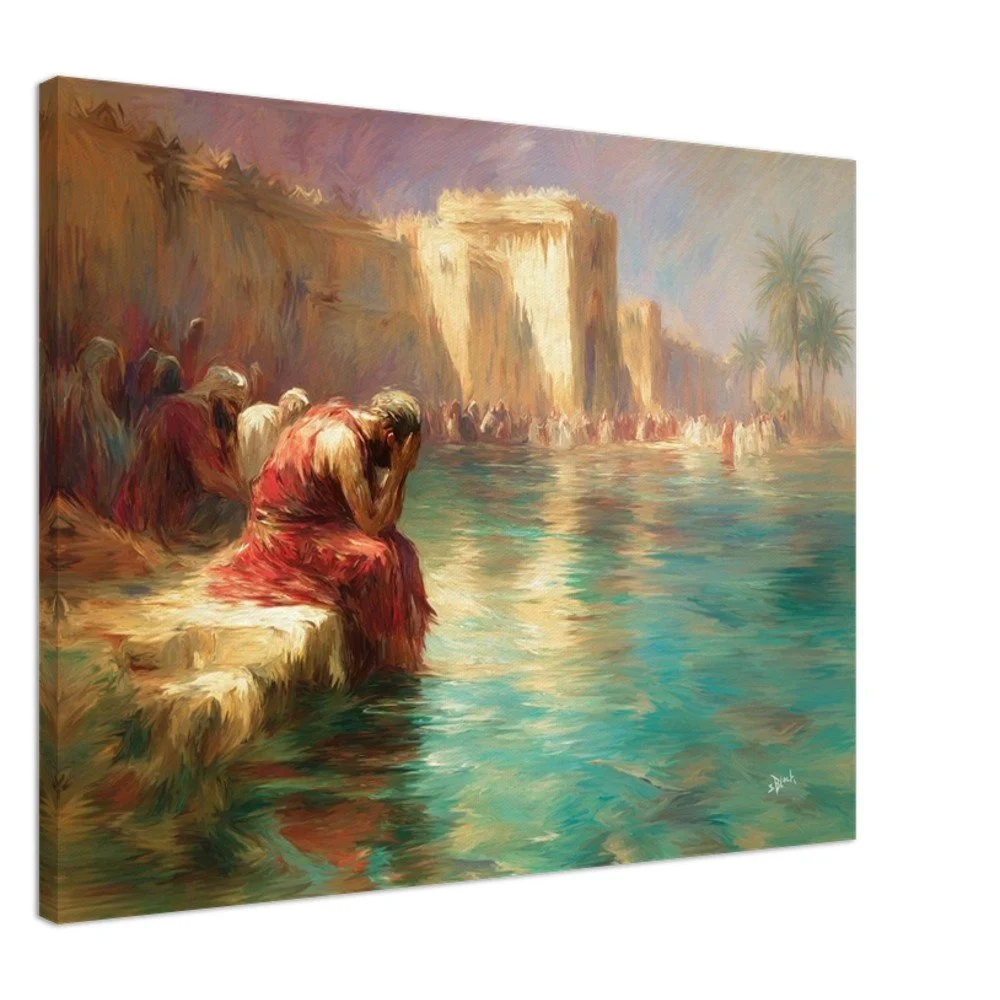 Bring the profound beauty of "By the Rivers of Babylon" to your walls with this stunning canvas print, featuring the poignant words of Psalms 137:1. "There we sat and also wept, when we remembered Zion." This piece combines enhanced texture and timeless beauty, offering an immersive art experience. Crafted on a durable cotton-polyester blend (300-350gsm) stretched over responsibly sourced FSC-certified wood